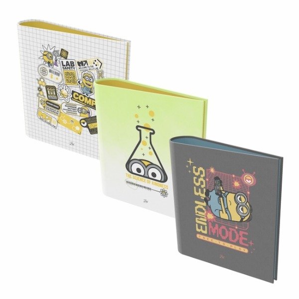 Carpeta 3 anillos cartone con relieve. Minions 3 diseños. Science: LACA UV+RELIEVE Science Green: LACA UV Gamer Mode: STAMPING ROJO + LACA UV