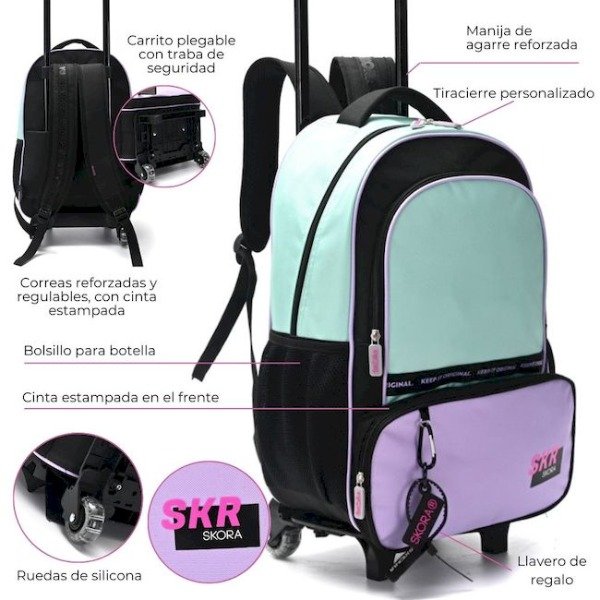 Incluye: - Llavero de regalo - Ruedas de silicona - Tiracierre personalizado - Manija de agarre reforzada - Carrito plegable con traba de seguridad - Correas reforzadas y regulables, con cinta estampada - Bolsillo para botella - Cinta estampada al frente - Medida del producto: 45 x 32 x 15 cm. - Material: Poliester