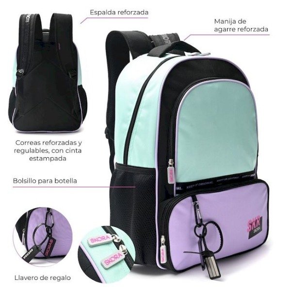- Incluye: - Llavero de regalo - Manija de agarre reforzada - Espalda reforzada - Correas reforzadas y regulables, con cinta estampada - Bolsillo para botella - Medida del producto: 45 x 32 x 15 cm. - Material: Poliester