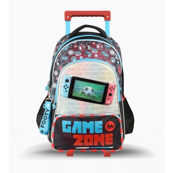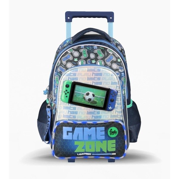 Incluye: - Llavero de regalo - Con tiras reforzadas y manijas de agarre - Con 3 compartimentos y 2 bolsillos laterales para botella - Estampa sublimada y aplique de moving patch - Frente con material holográfico termoformado con consola de juego - Material: Poliéster - Capacidad: 20 L.